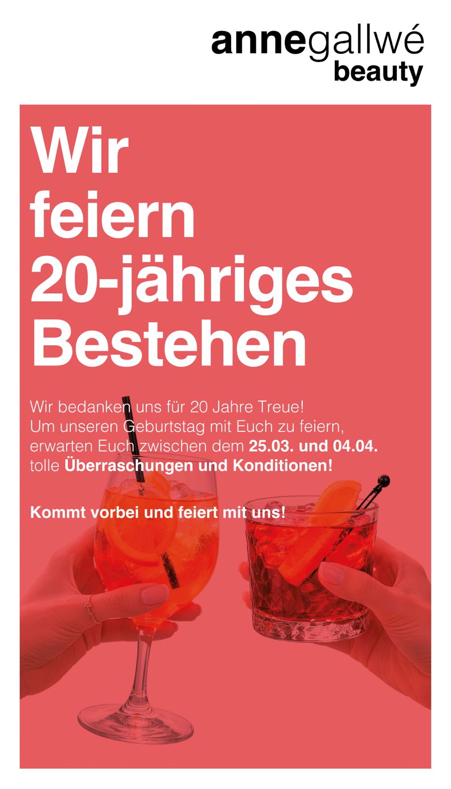 Kommt vorbei, genießt die Atmosphäre und feiert gemeinsam mit uns 20 Jahre anne gallwé beauty.