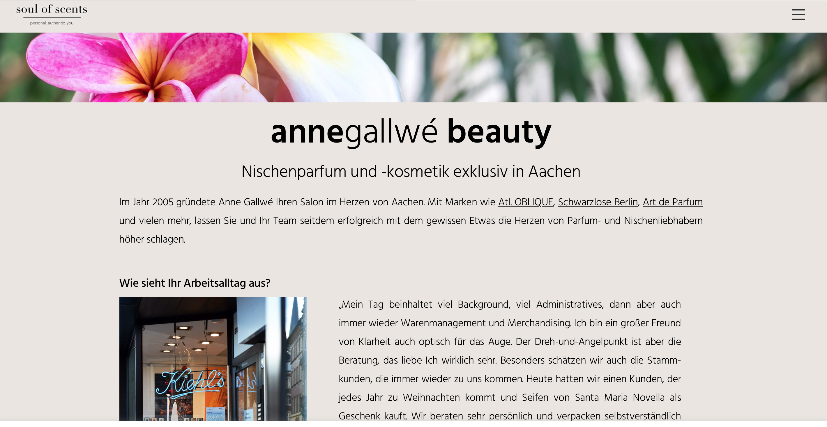 Presseartikel Soul of scents von Anne Gallwé 11. Februar 2021 https://soulofscents.de/annegallwe-beauty/?fbclid=IwAR2UyJW0Ug0MUOgPM_cEqcBQhfzb1iAF3mKWC-Y8ZDjFe9QlsHYva_EVP6s Beitrags-Navigation Vorheriger Beitrag Zarkoperfume – The MuseVorheriger Beitrag Nächster Beitrag Mabou – Boxes of AlemeeNächster Beitrag